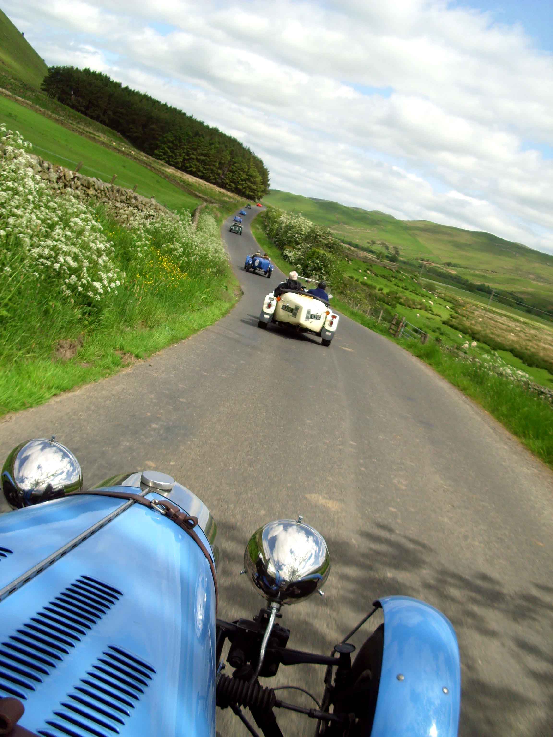 Below: Sheila and Ron at speed in Hirondelle in Scottish Border country… (photo Ian Ramsey – thanks)